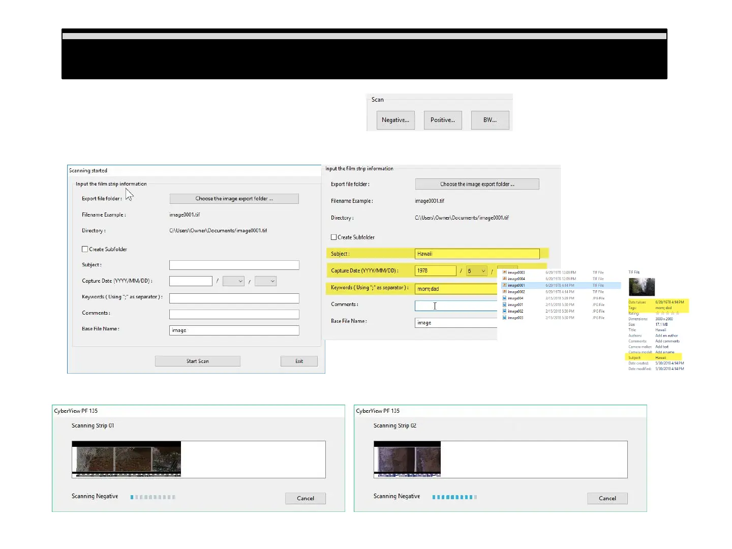 b. Scanning started window, here you can input the filmstrip information