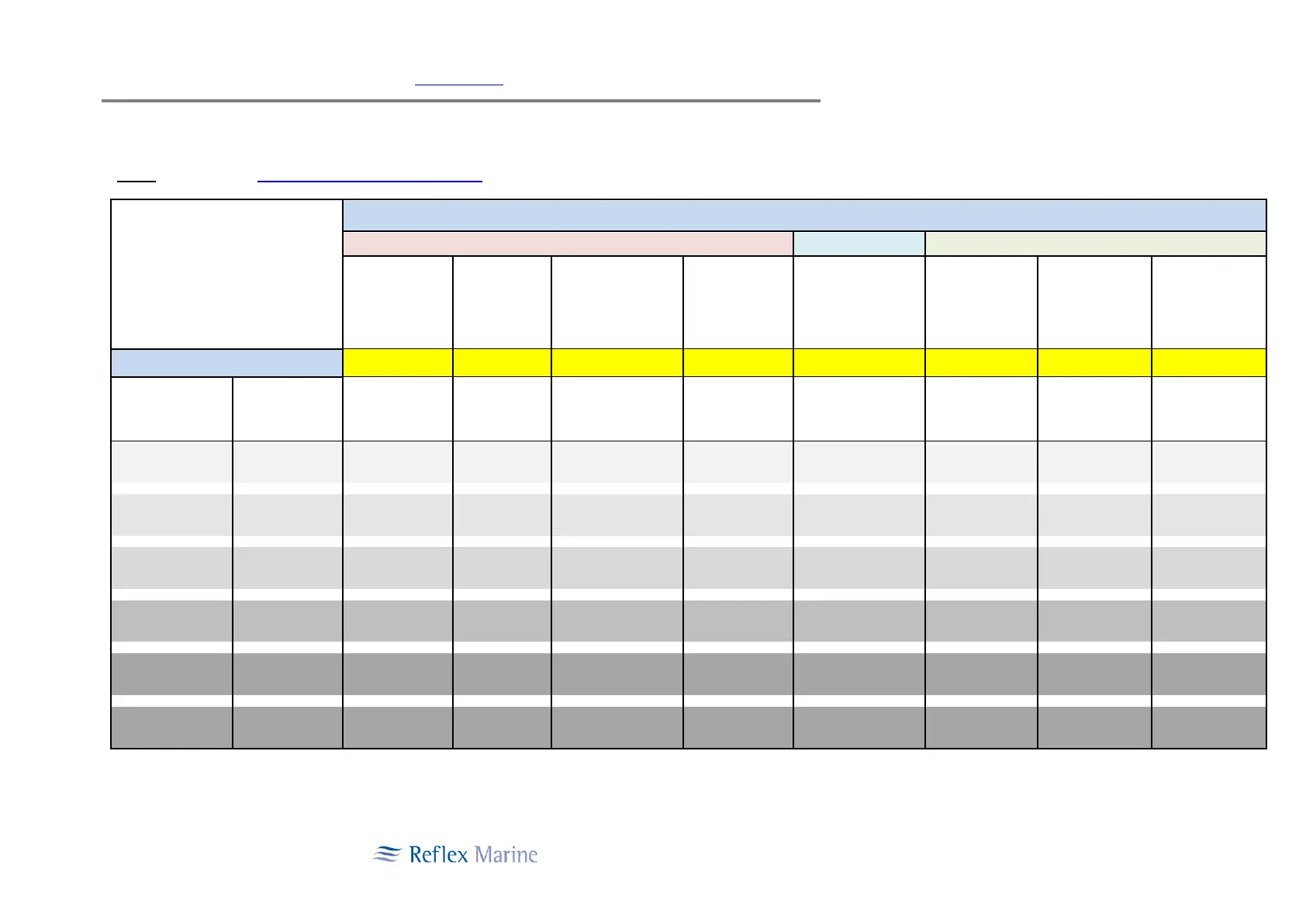 (NOTE: RML website www.reflexmarine.com/support should be checked for the latest version of this table)