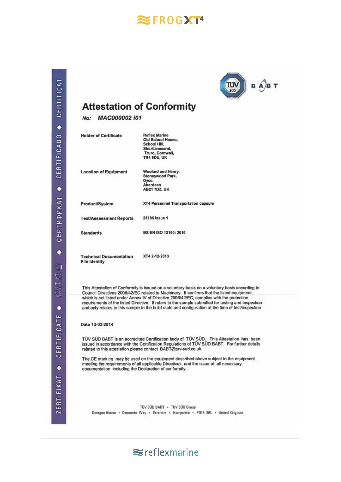 Reflex Marine FROG-XT4 - 7 Certificates; EC Attestation of Conformity