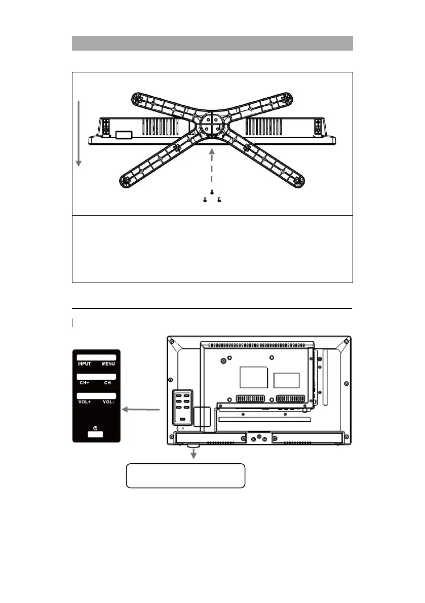 2. Screw the centre piece (B) to the TV set using the screws (C) supplied and a screwdriver