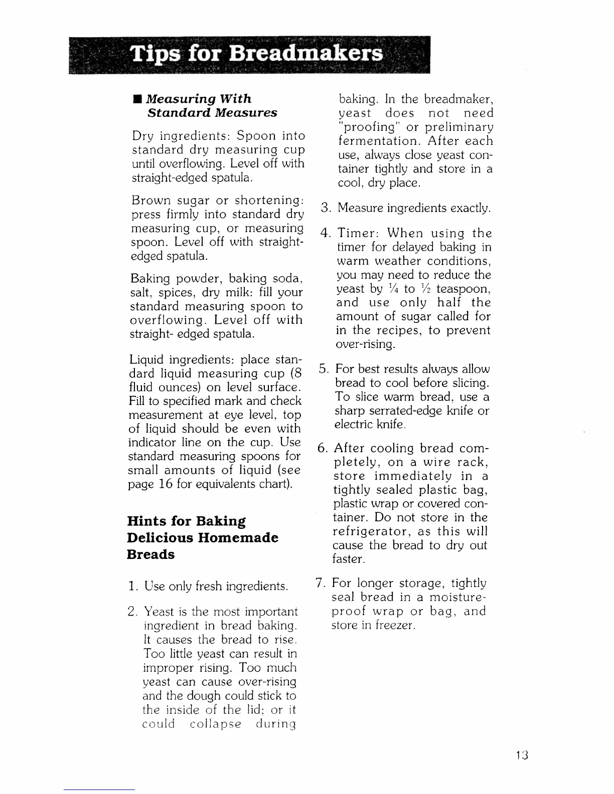 Regal C6750 - Tips for Breadmakers; Measuring With Standard Measures; Hints for Baking Delicious Homemade Breads