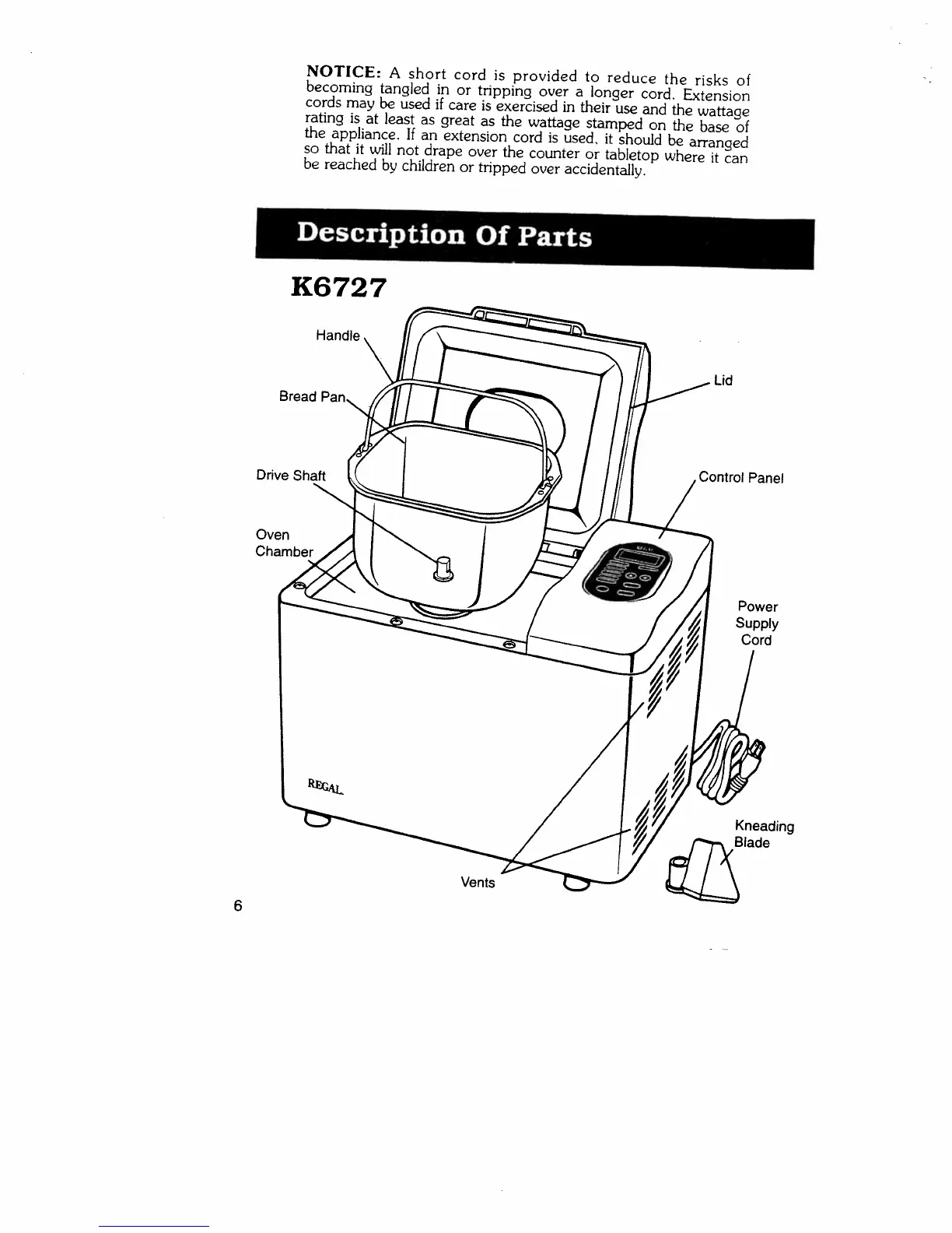 Regal K6722 - Description Of Parts