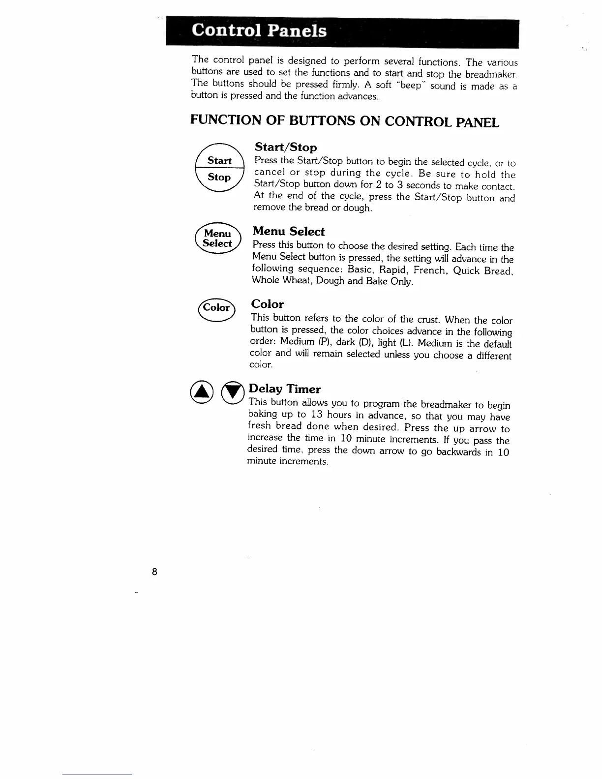 Regal K6722 - Control Panels; FUNCTION OF BUTTONS ON CONTROL PANEL