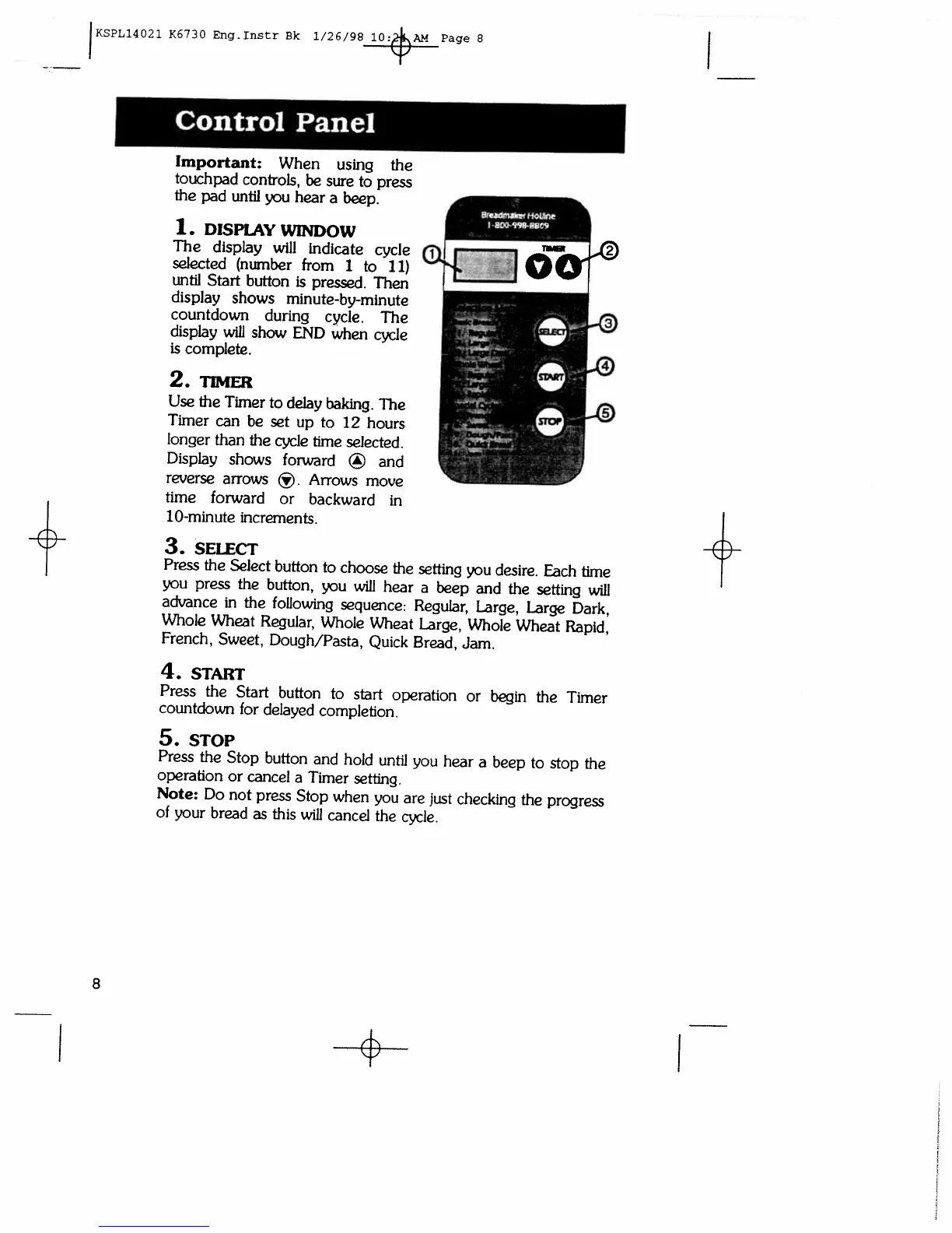 Regal K6730 - Control Panel