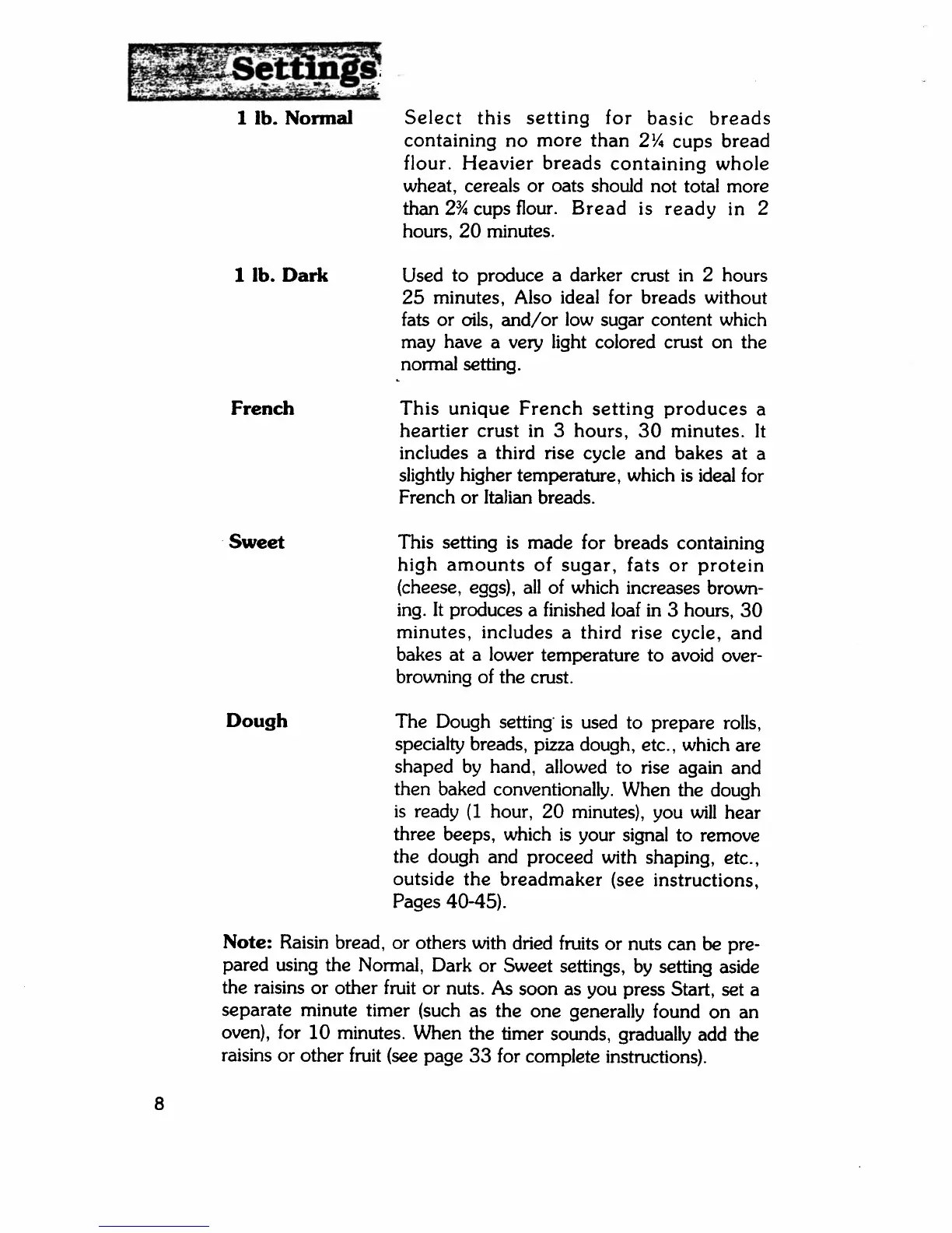Regal K6769C - Breadmaker Settings Overview