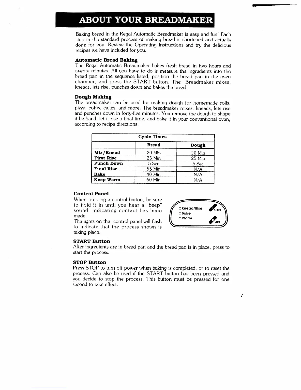 Regal k6774 - ABOUT YOUR BREADMAKER; Automatic Bread Baking; Dough Making; Control Panel