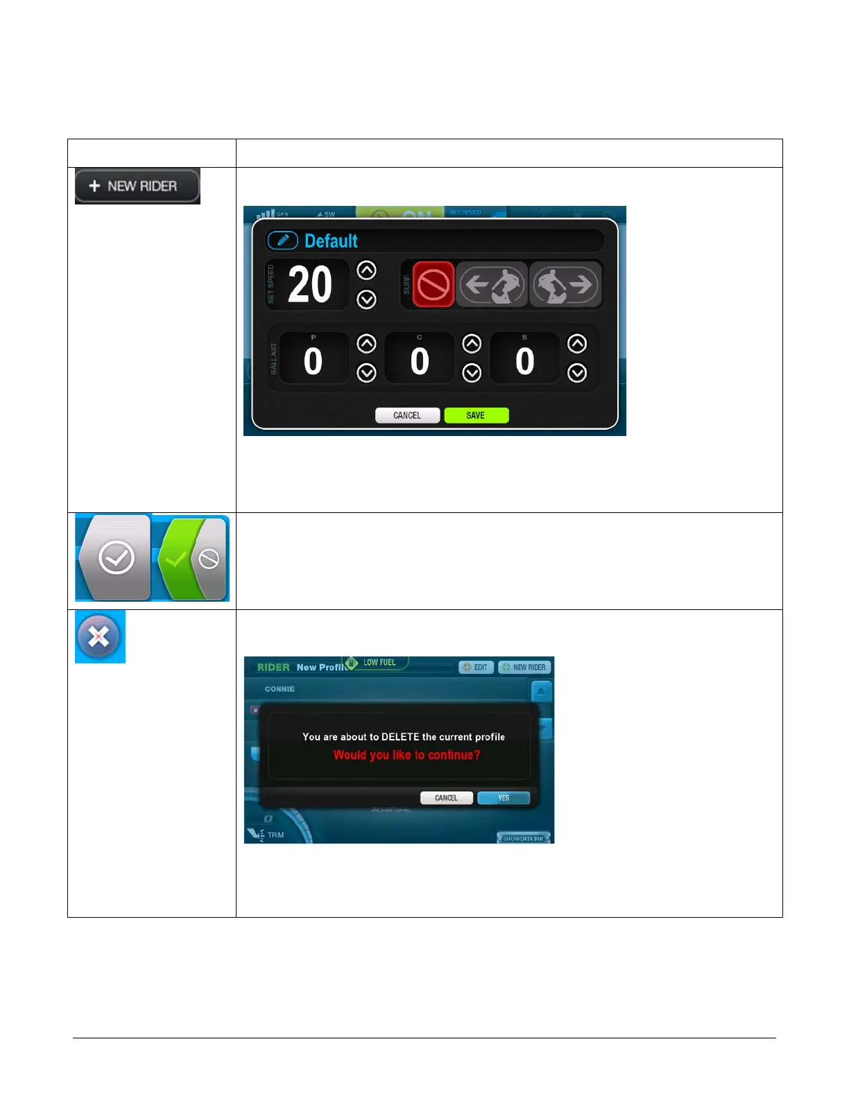 DELETE RIDER PROFILE – Touch this to delete the selected rider