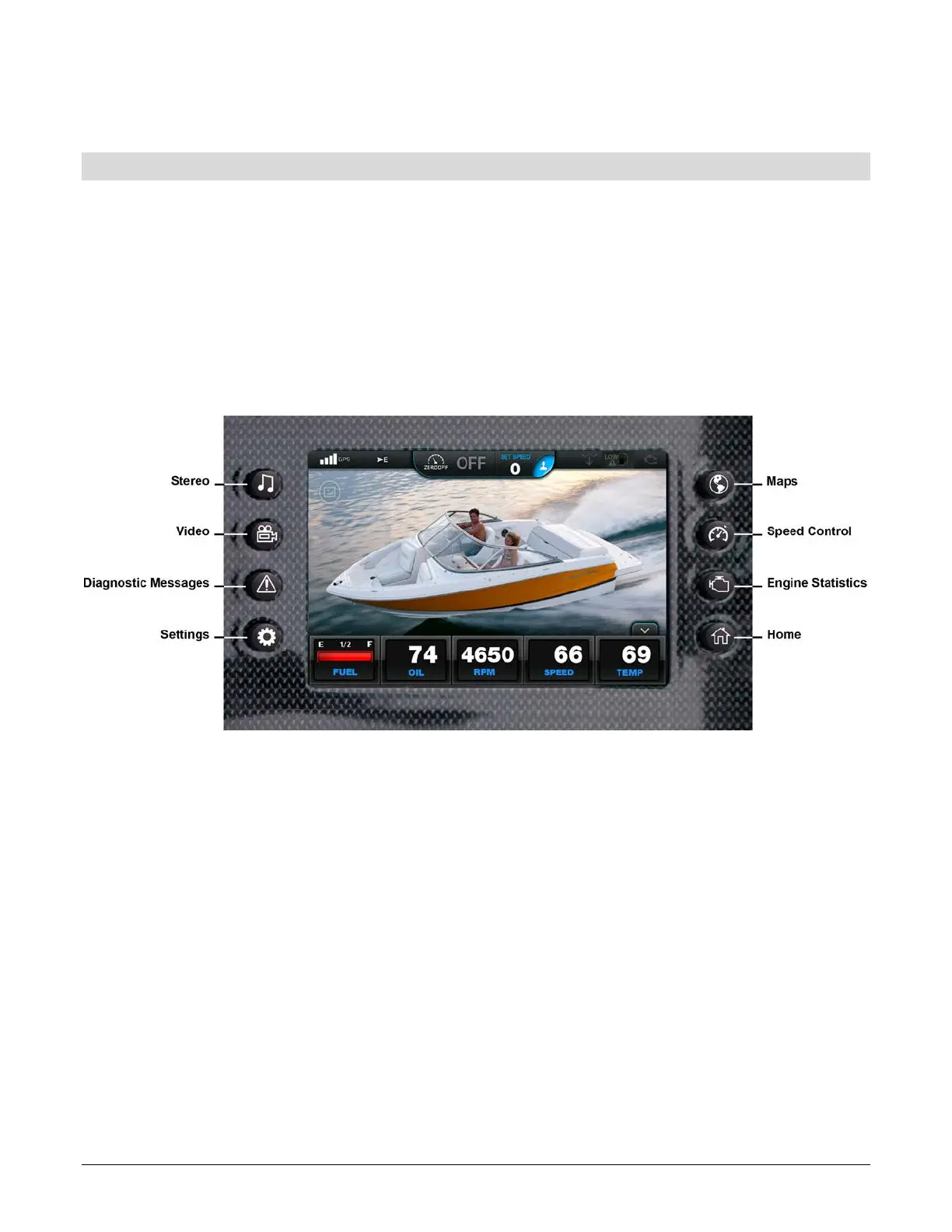 settings, maps, speed control, engine statistics and Home.