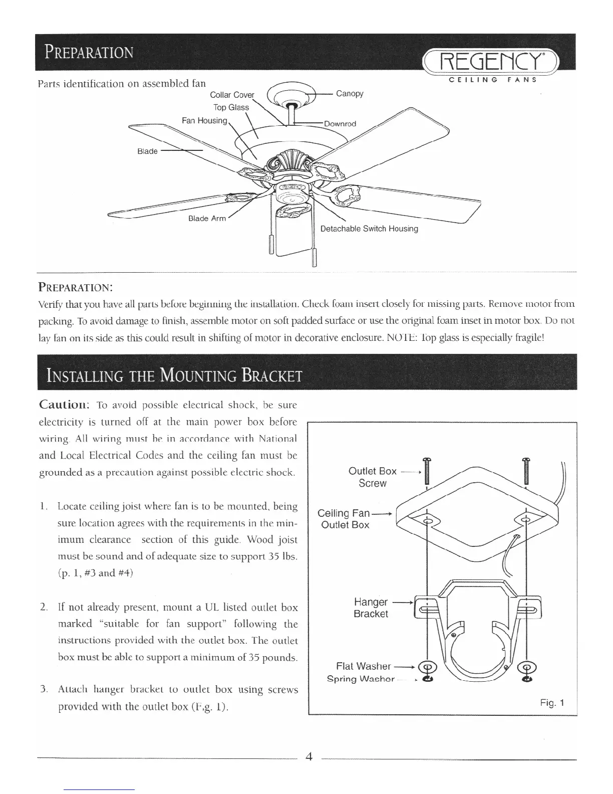Regency Ceiling Fans Coronado - Preparation; Installing the Mounting Bracket