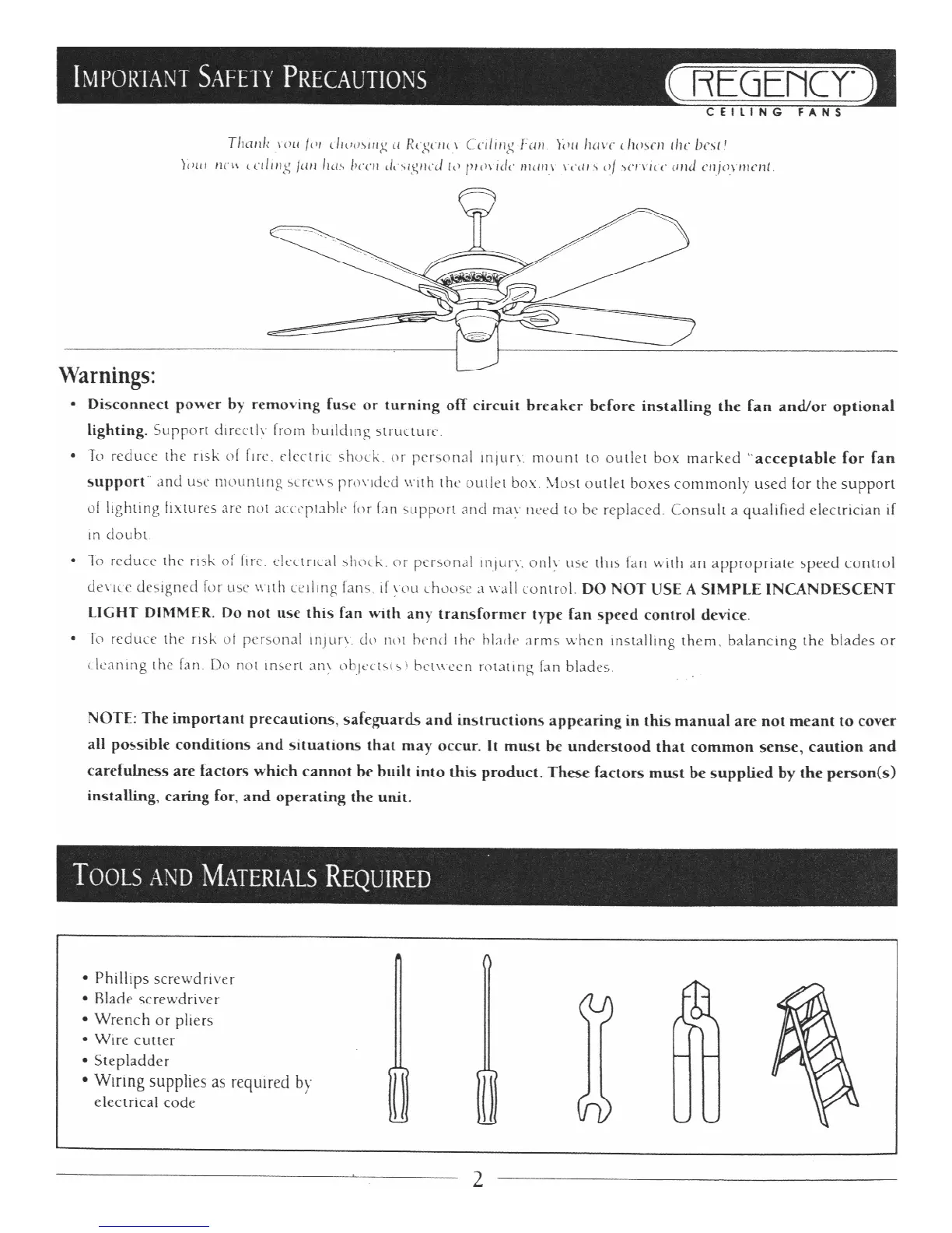Regency Ceiling Fans Jasmine - Safety Warnings & Tools; Specific Warnings; Tools and Materials Required