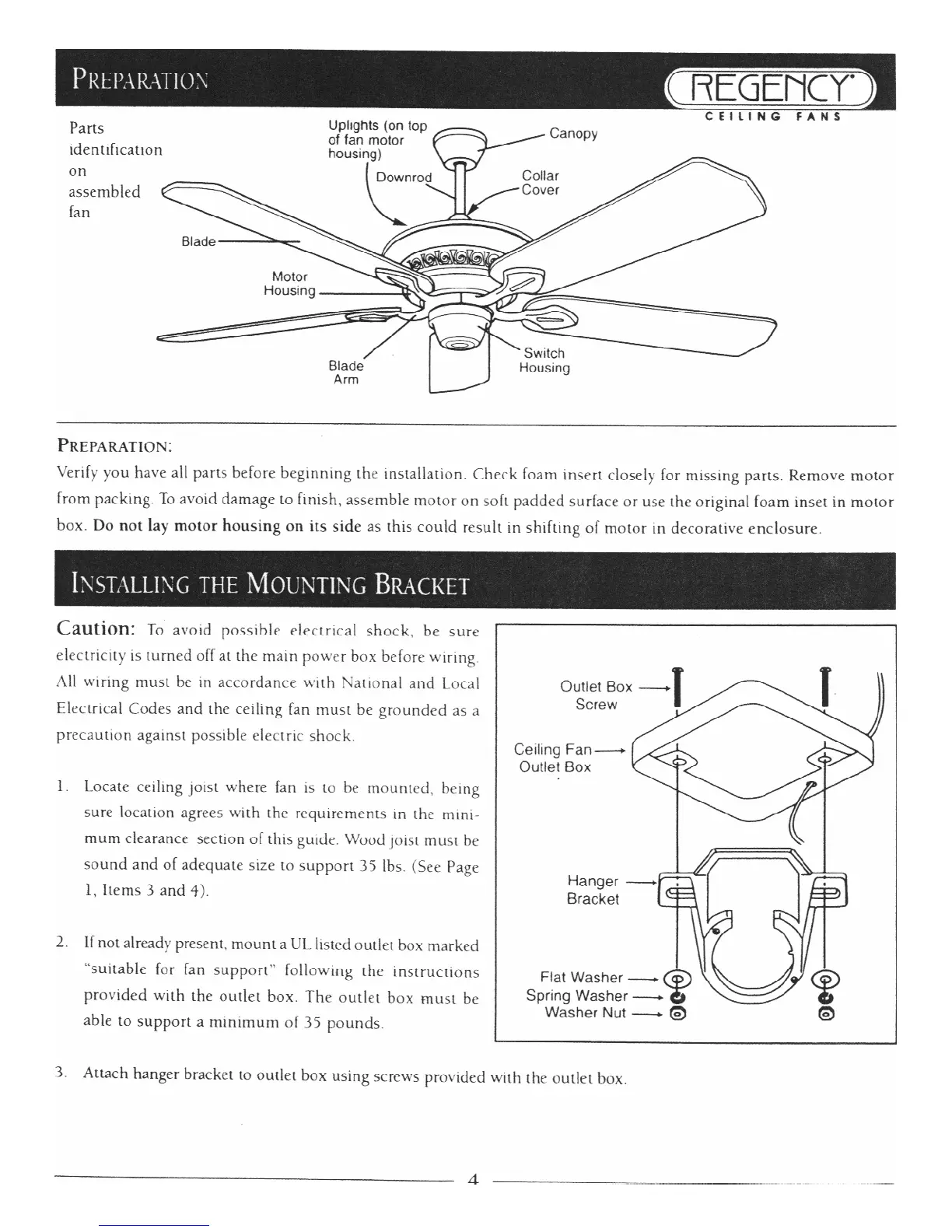 Regency Ceiling Fans Jasmine - Installation Process; Preparation and Mounting Bracket