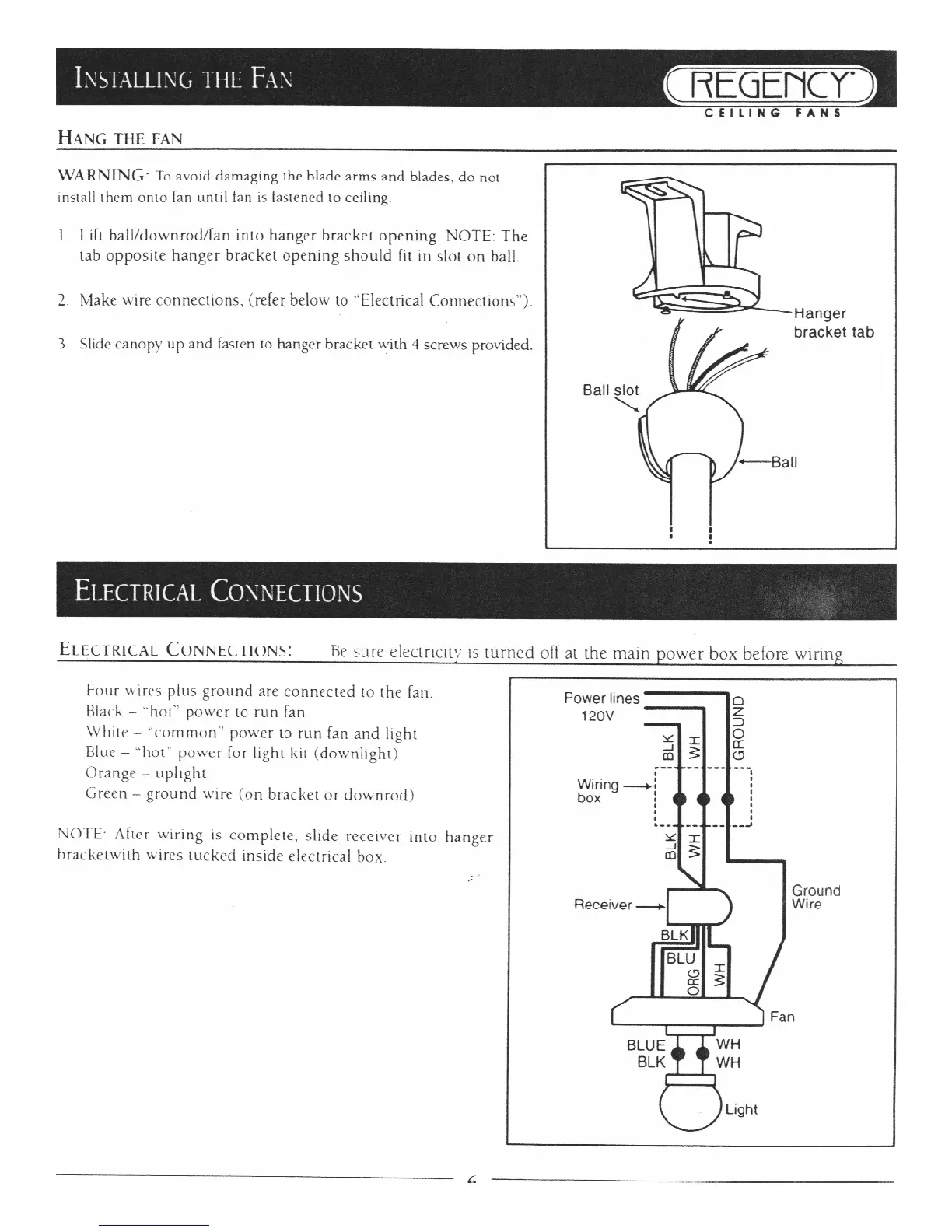 Regency Ceiling Fans Jasmine - Hanging the Fan; Electrical Connections
