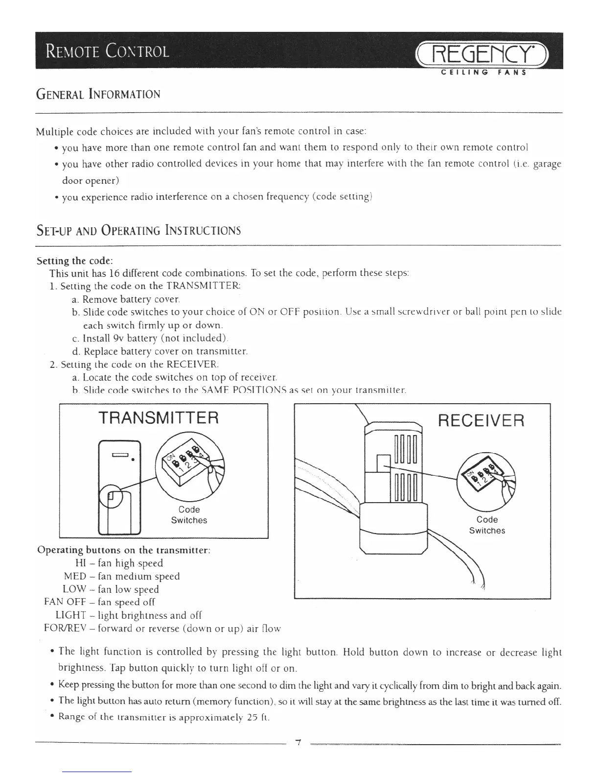 Regency Ceiling Fans Jasmine - Remote Control; General Information; Setup and Operating Instructions