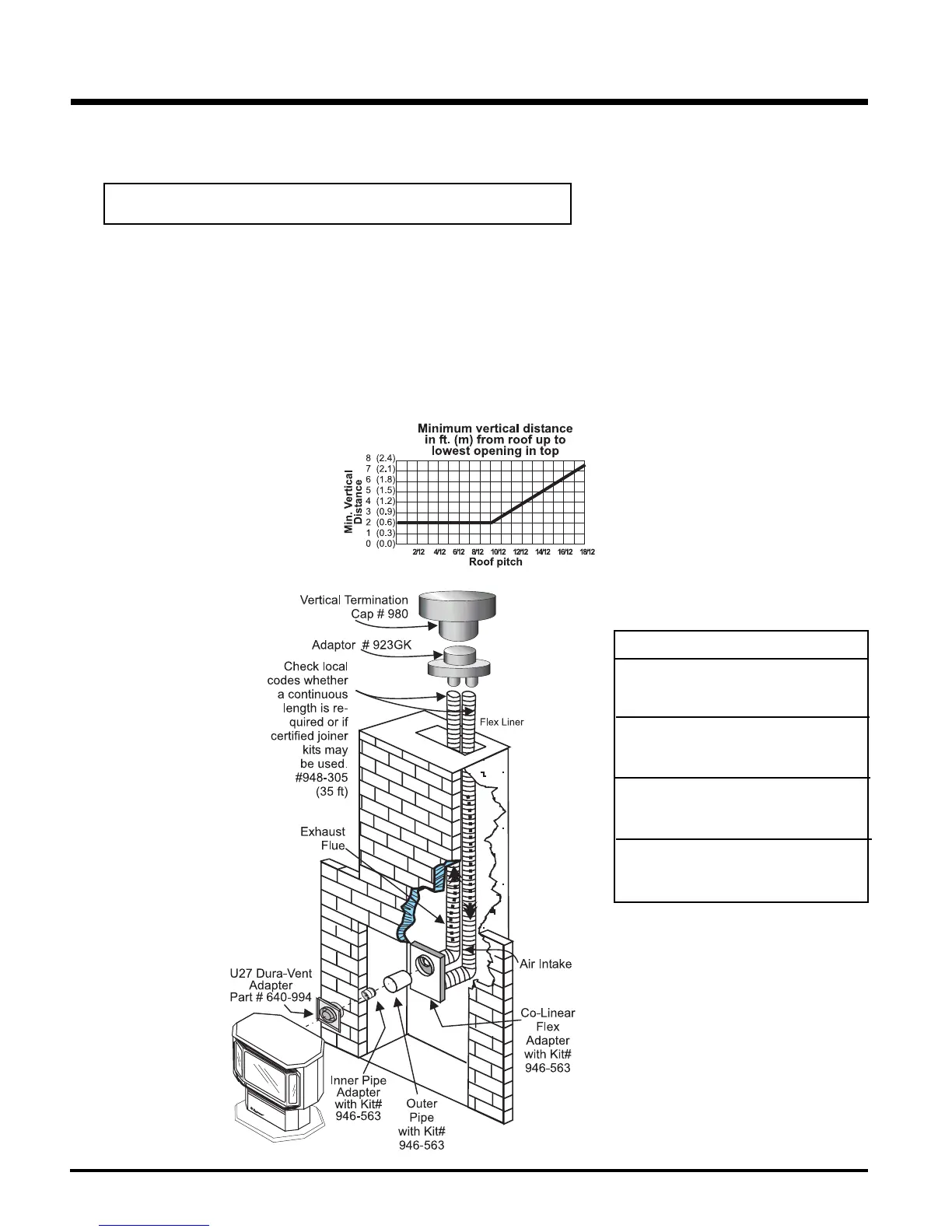 tion for minimum and maximum fl ue lengths. See chart below for minimum distances from roof.
