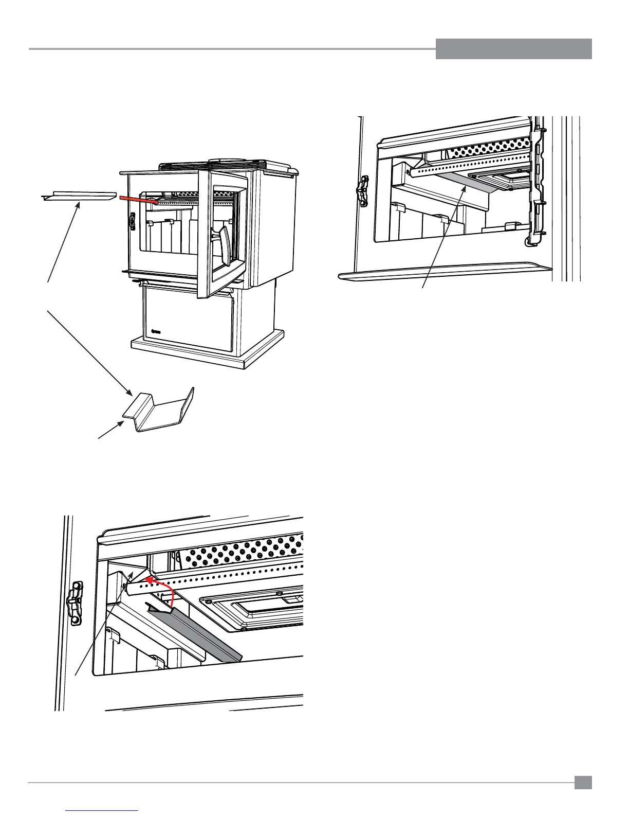 2. Open stove door bring the side baffl e into the stove in the orientation shown