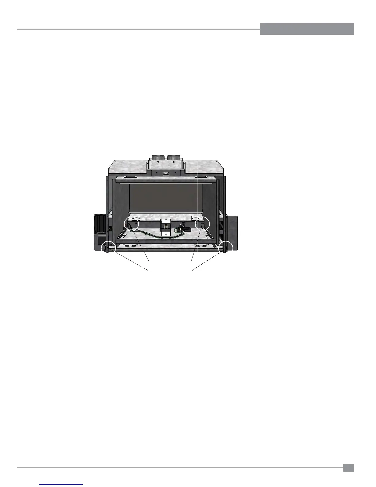 Remove left and right side fi ller pieces.The rear levelling bolts are located in the back corners of the fi rebox and can be adjusted using a 7/16" wrench.