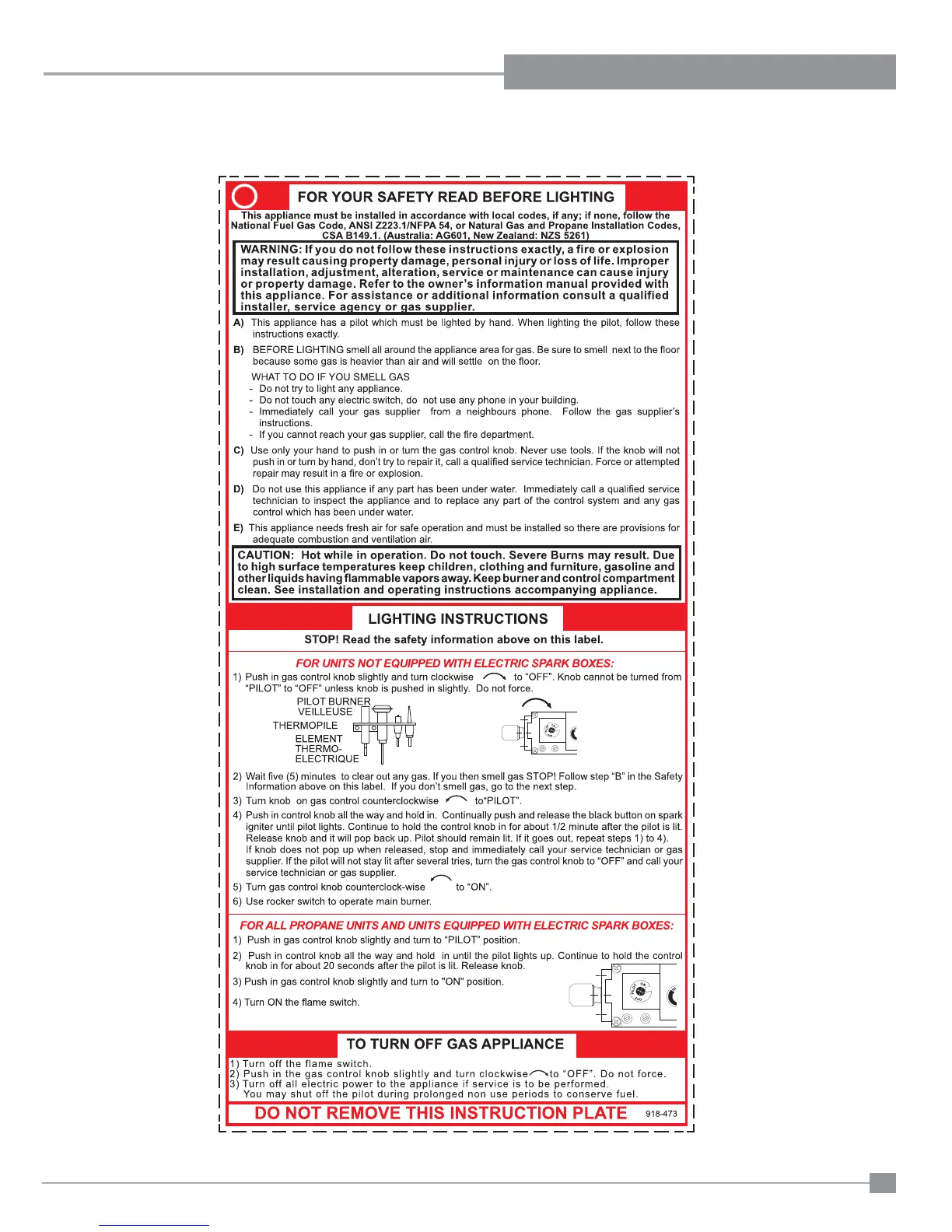 Regency P33-NG4 - Operating Instructions; Lighting Plate Instructions