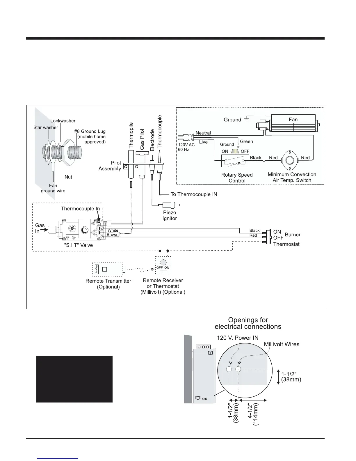This heater does not require a 120V A.C. supply for operation. In case of a power failure, the burner switch and the optional remote control/thermostat