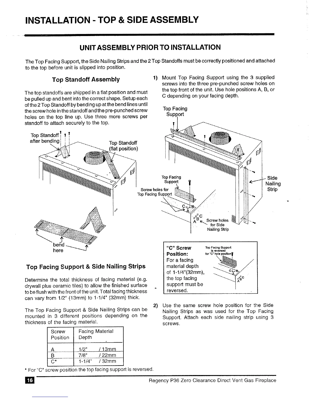 Regency P36-NG - Installation - Top and Side Assembly; Unit Assembly Prior to Installation; Top Standoff Assembly; Top Facing Support and Side Nailing Strips