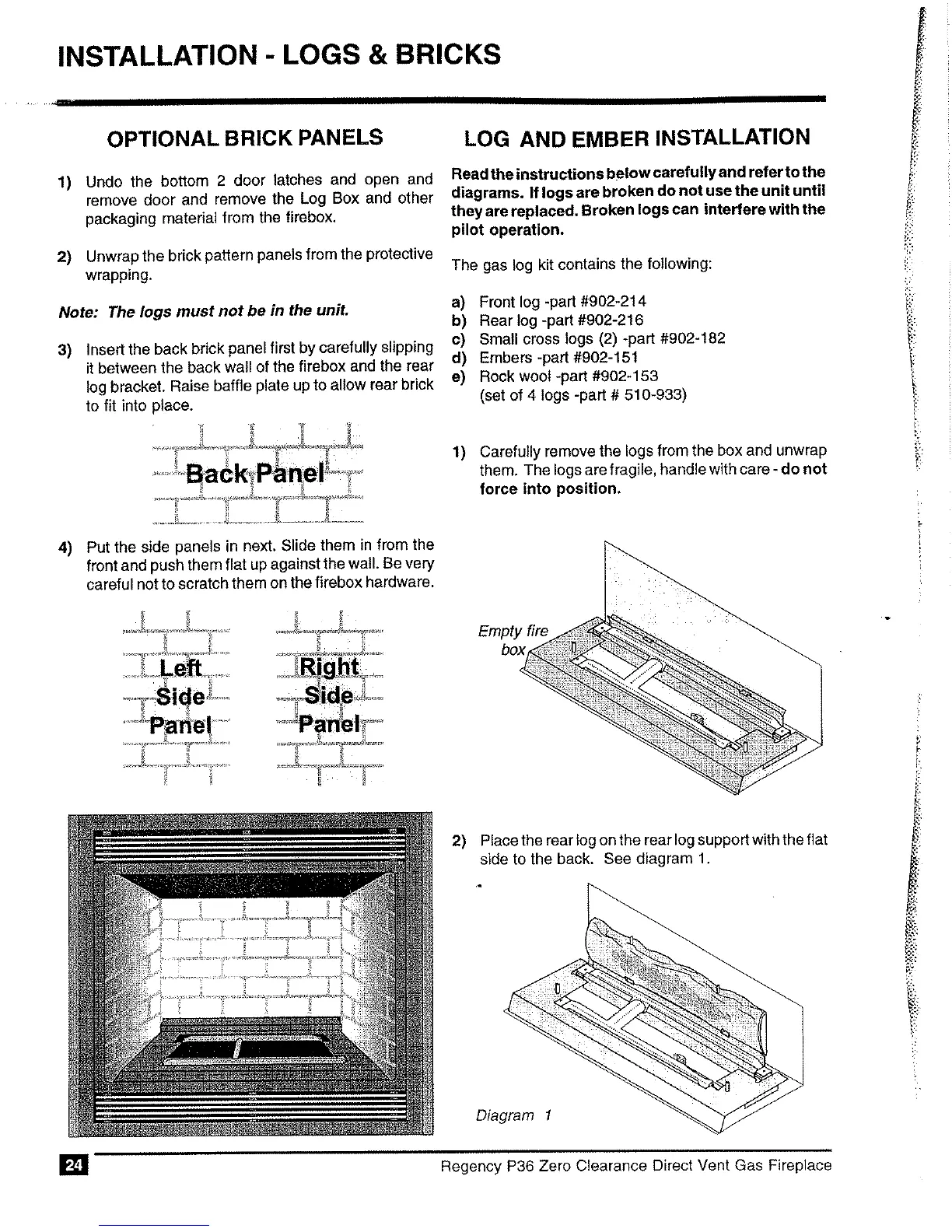Regency P36-NG - Installation - Logs and Bricks; Optional Brick Panels; Log and Ember Installation