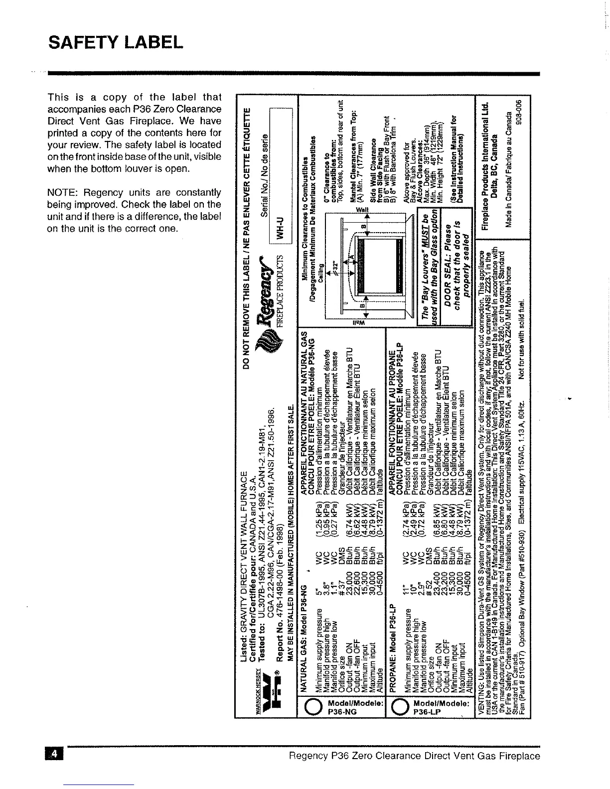 Regency P36-NG - Installation Requirements; Safety Label