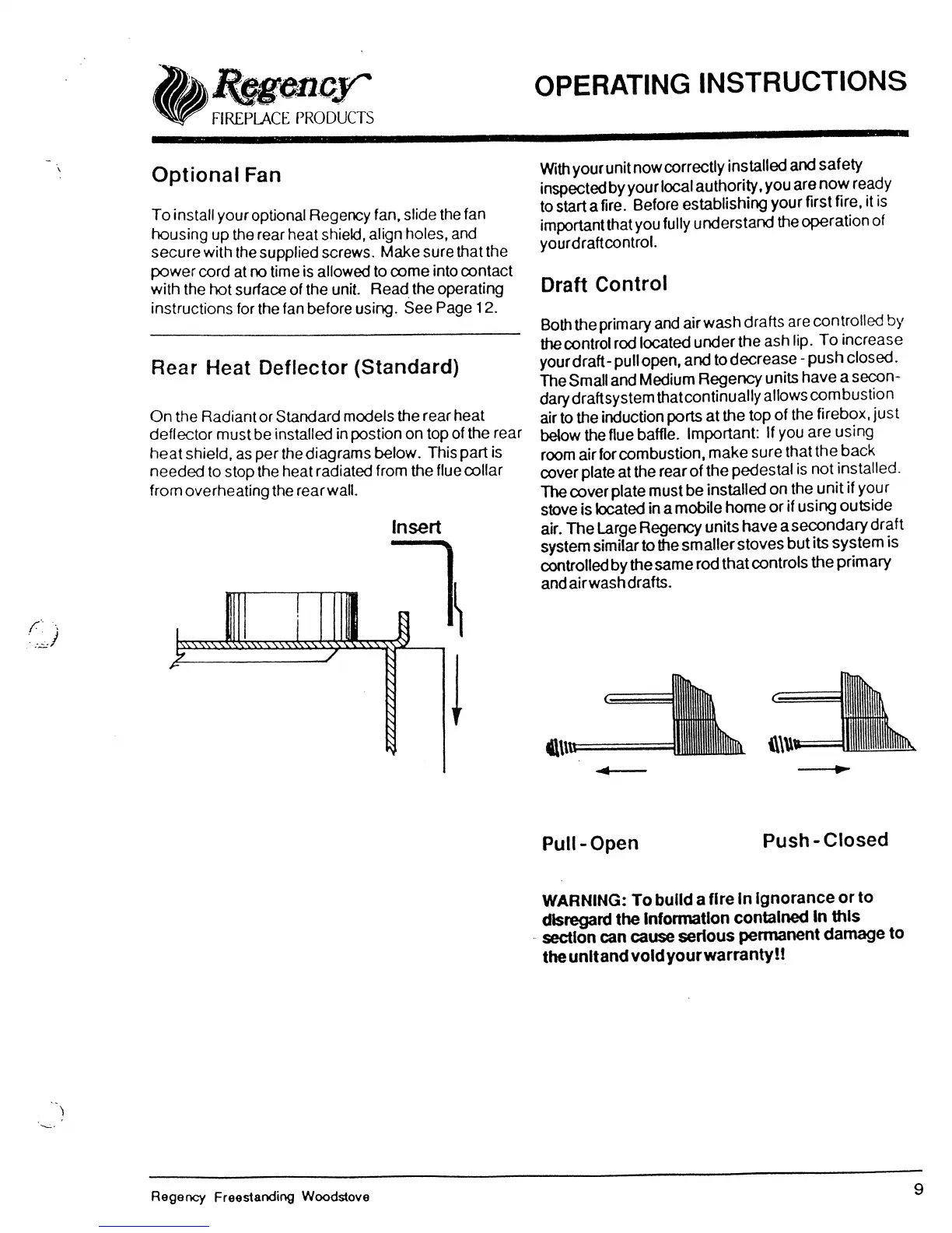 Regency R3 - Optional Fan Installation; Rear Heat Deflector Installation; Operating Instructions; Draft Control Operation
