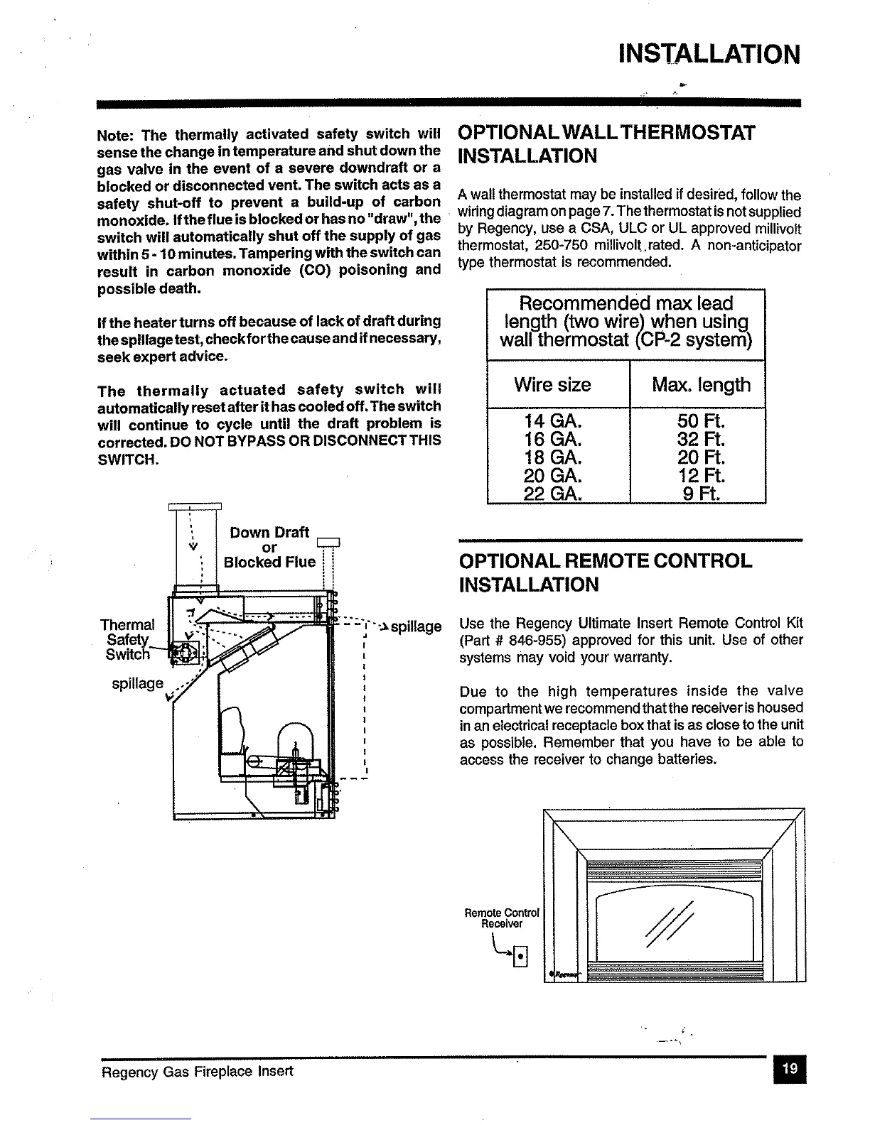 Regency U31-NG - Optional Wall Thermostat Installation; Optional Remote Control Installation