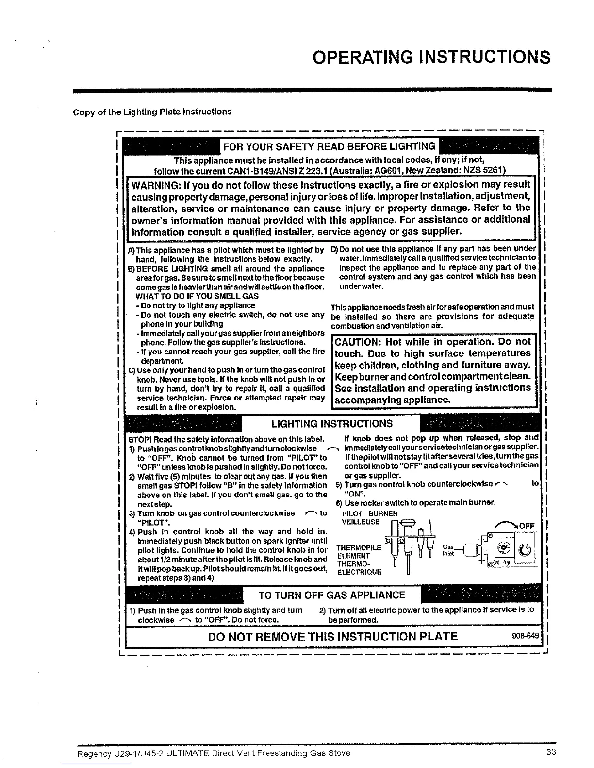 Regency ULTIMATE U29-LP1 - Operating Instructions; Copy of the Lighting Plate; Lighting Instructions; To Turn off Gas Appliance