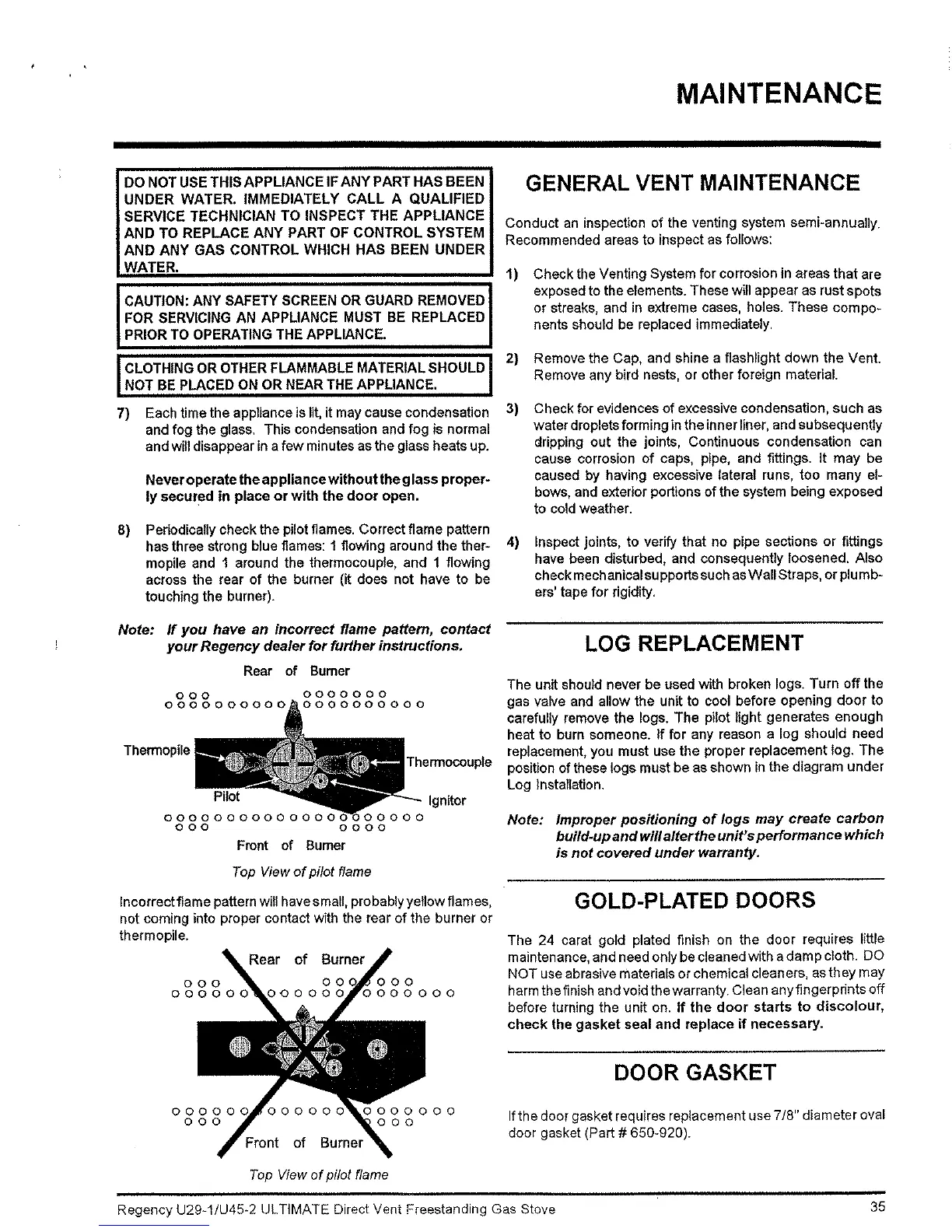 Regency ULTIMATE U29-LP1 - Maintenance; General Vent Maintenance; Log Replacement; Gold-Plated Doors