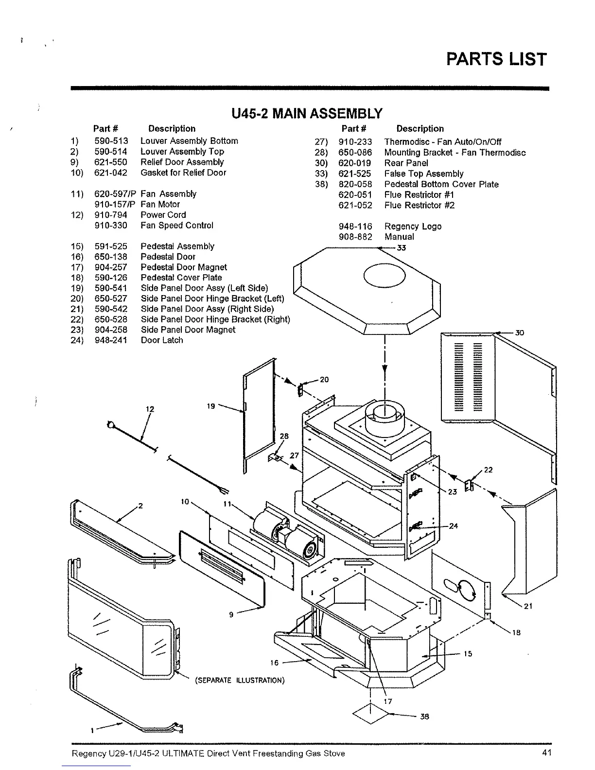 Regency ULTIMATE U29-LP1 - Parts List; Main Assembly