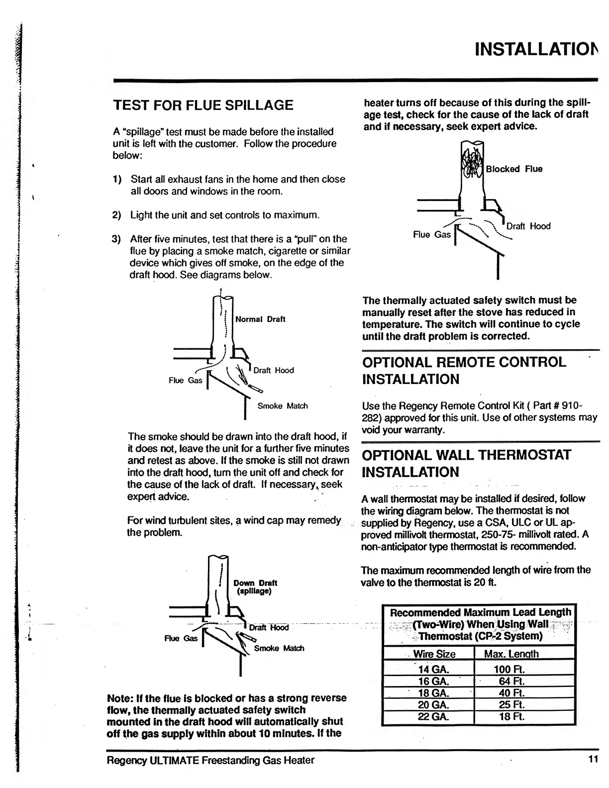 Regency ULTIMATE U41FS-LP - Test for Flue Spillage; Optional Remote Control Installation; Optional Wall Thermostat