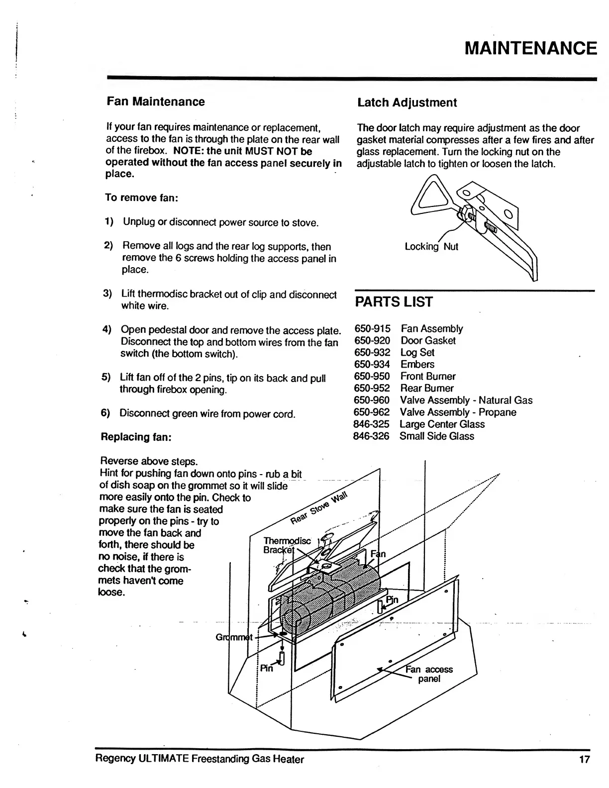 Regency ULTIMATE U41FS-LP - Fan Maintenance; Latch Adjustment; Parts List
