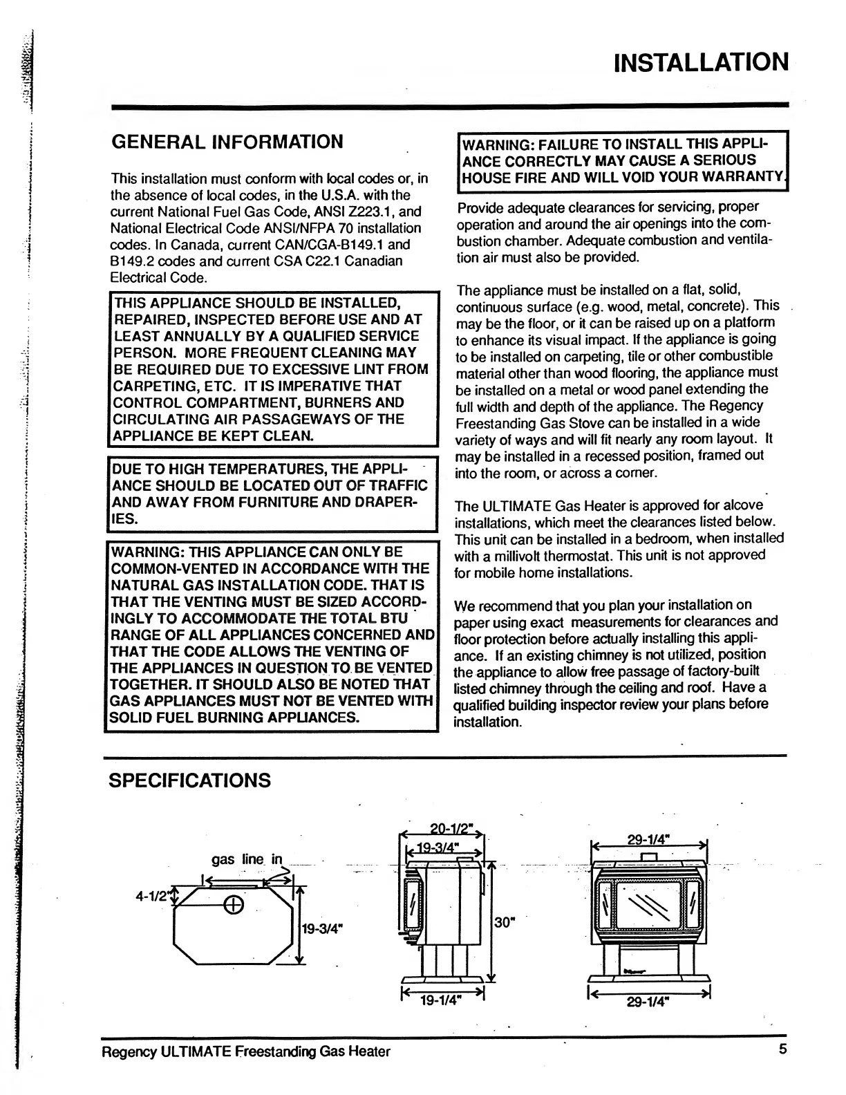 Regency ULTIMATE U41FS-NG - Installation; General Installation Information; Specifications