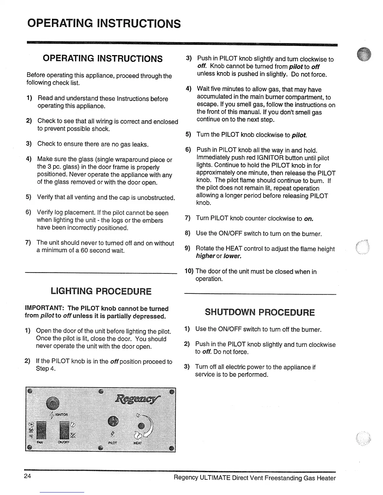 Regency Ultimate U45-NG - Operating Instructions; Lighting Procedure; Shutdown Procedure