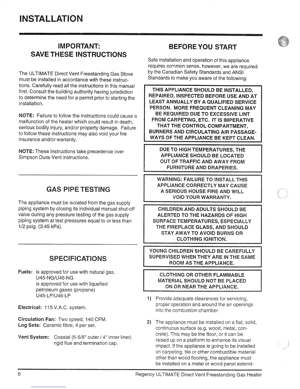 Regency Ultimate U45-NG - Installation; Gas Pipe Testing; Specifications; Before You Start