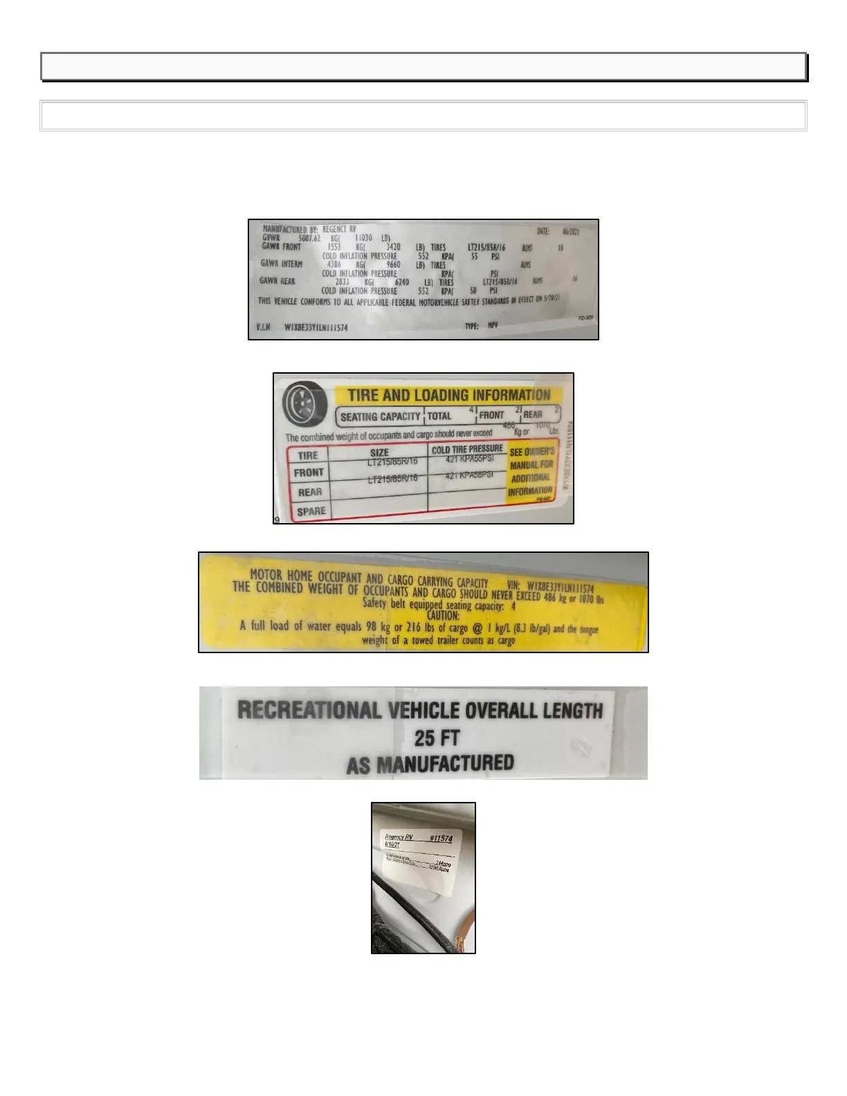 Located on the passenger side door frame. Includes VIN, build date, GVWR, GAWR and tire pressure information.