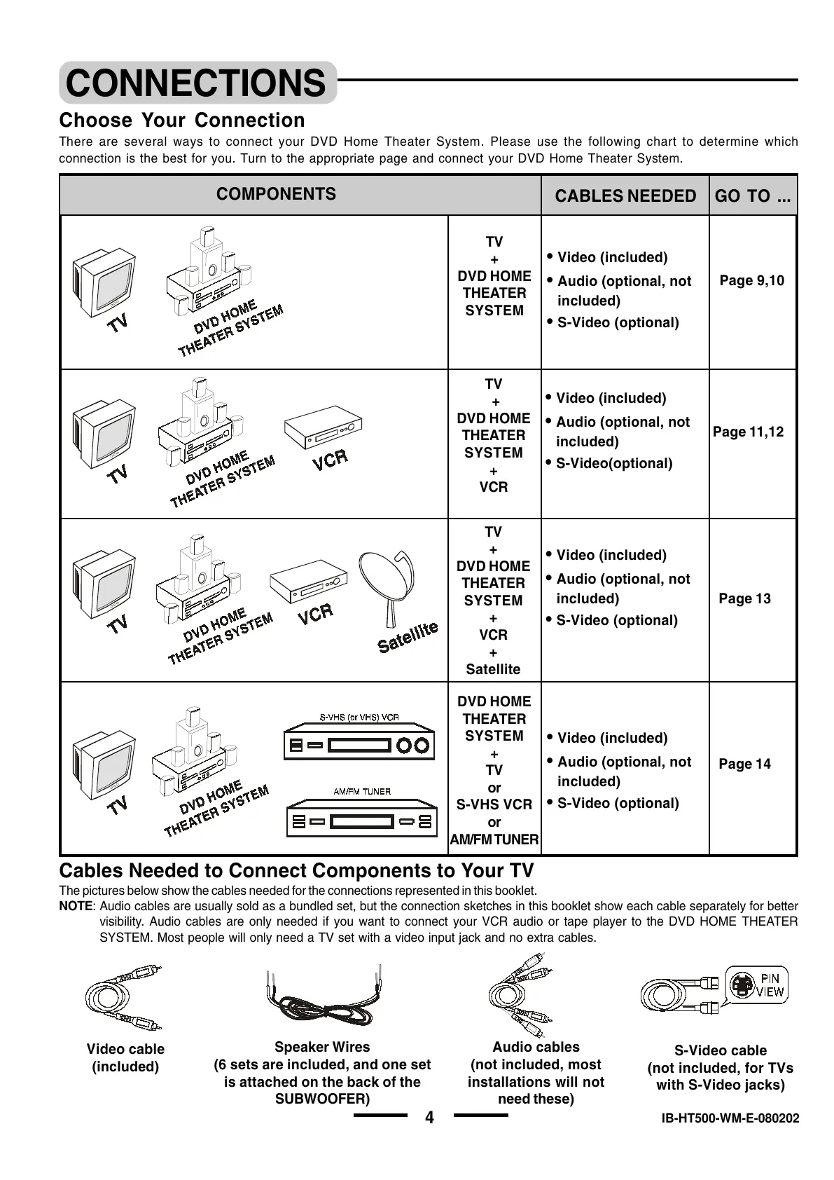 There are several ways to connect your DVD Home Theater System. Please use the following chart to determine which