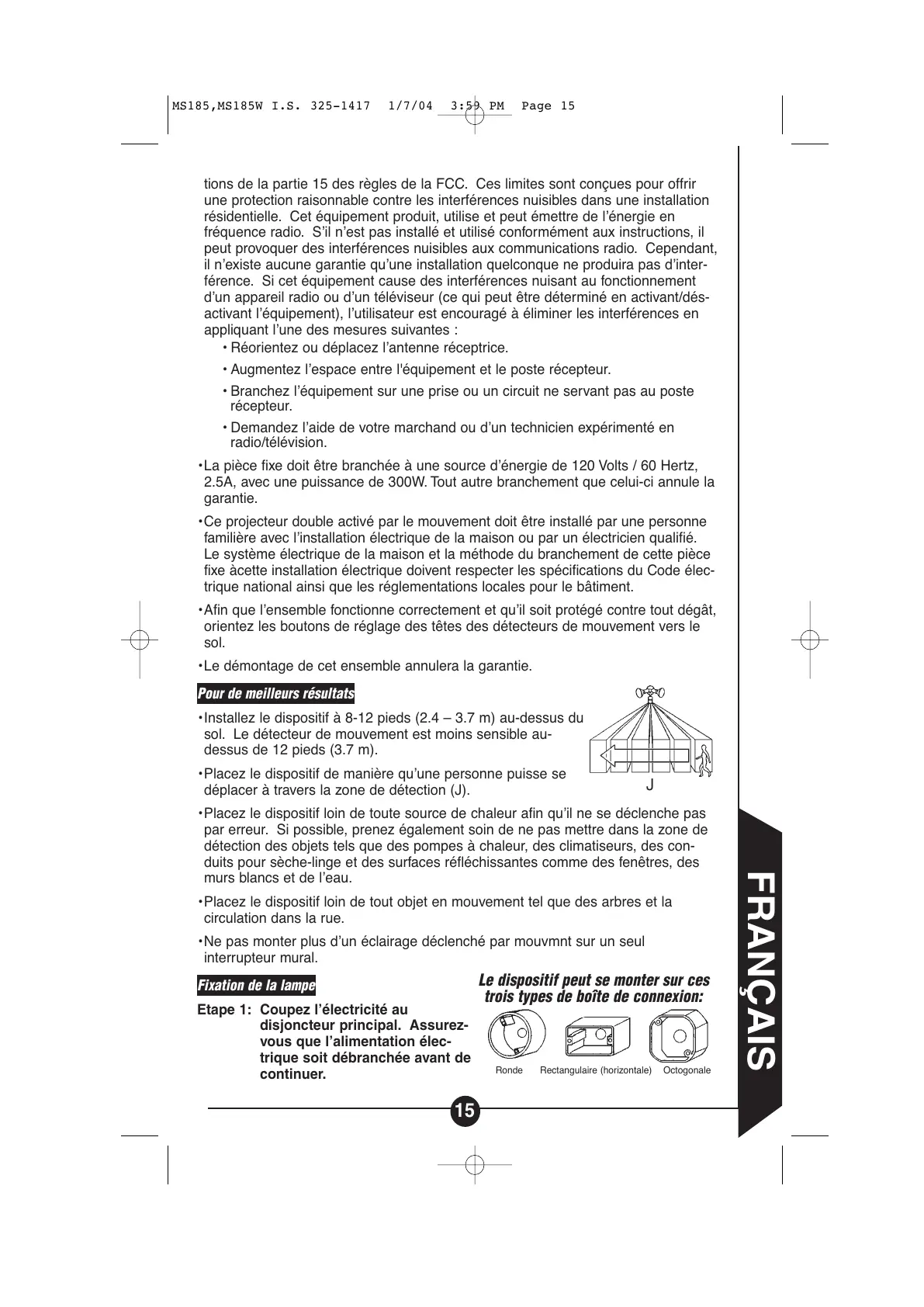 • La pièce fixe doit être branchée à une source d’énergie de 120 Volts / 60 Hertz,