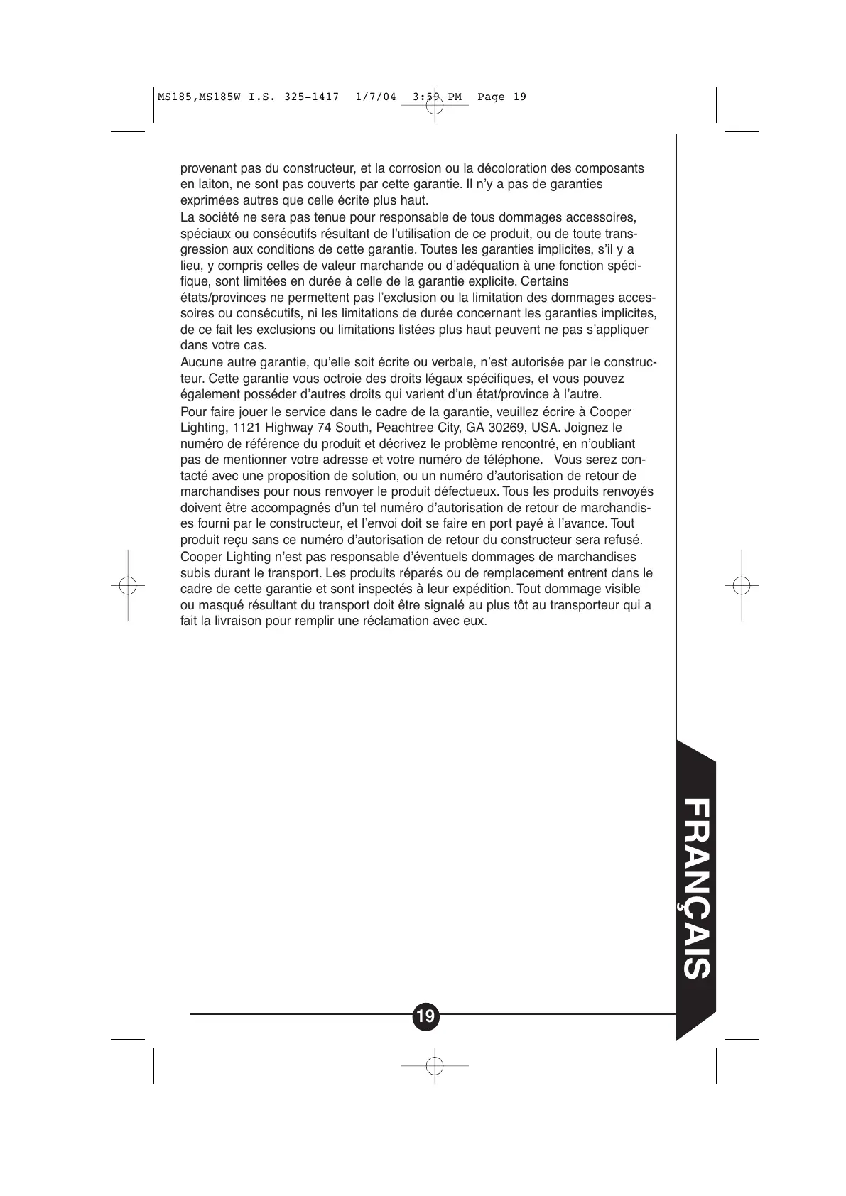 Cooper Lighting n’est pas responsable d’éventuels dommages de marchandises