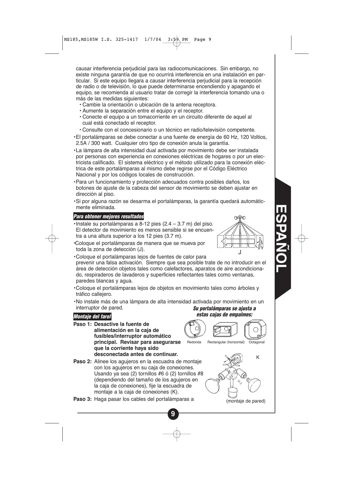 • La lámpara de alta intensidad dual activada por movimiento debe ser instalada