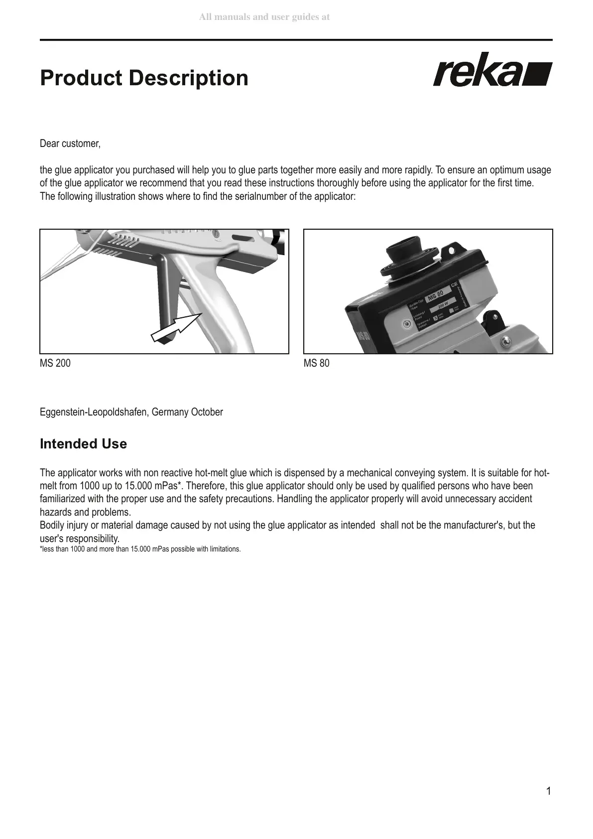 melt from 1000 up to 15.000 mPas*. Therefore, this glue applicator should only be used by qualified persons who have been