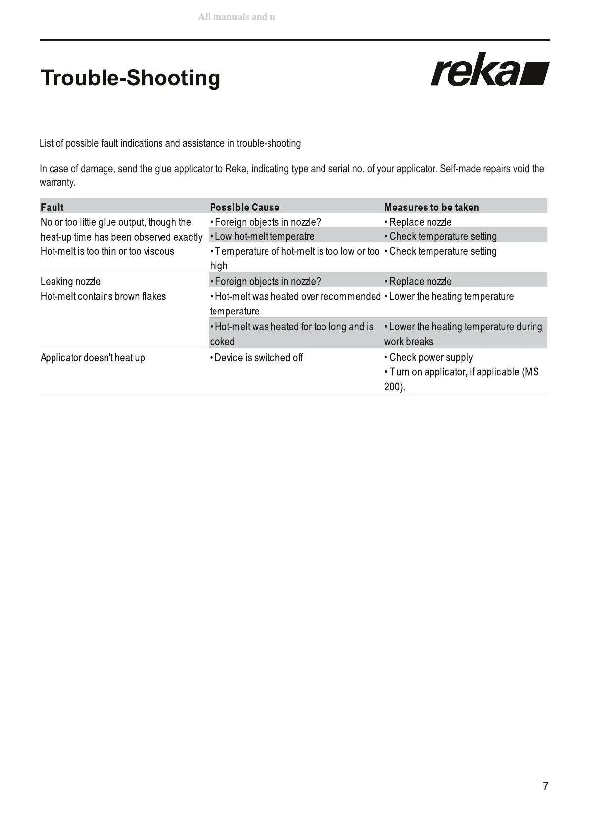 In case of damage, send the glue applicator to Reka, indicating type and serial no. of your applicator. Self-made repairs void the