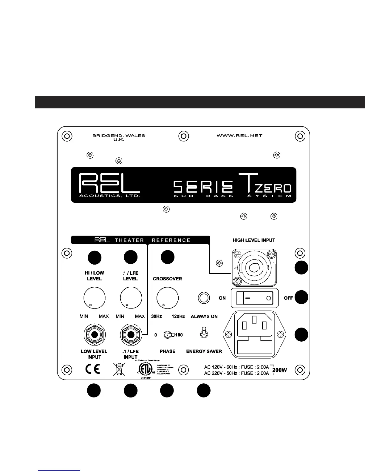 REL Acoustics TZERO - Rear Panel Connection Legend; Volume, Crossover, and Level Controls; Input and Power Connectors; Phase and Power Mode Switches