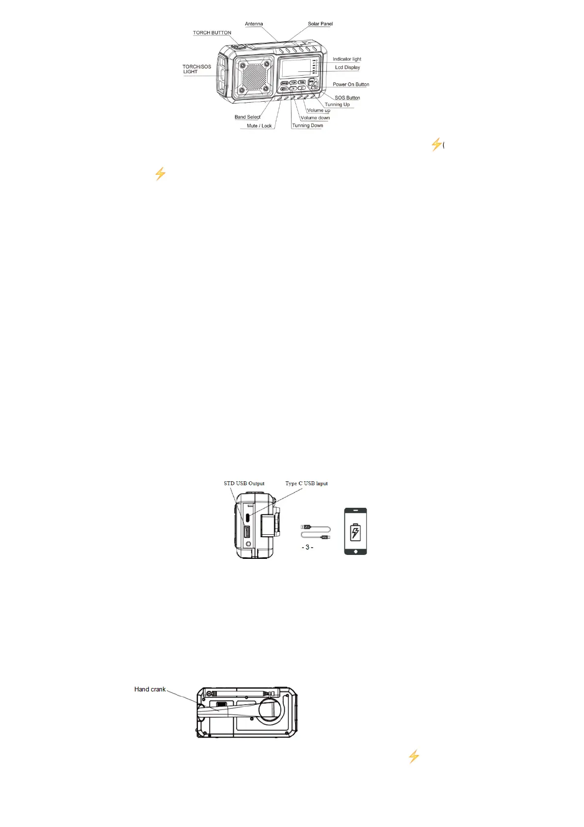(B) Dynamo à manivelle : La radio peut également être chargée en tournant la manivelle située sous l'appareil, ce qui active la