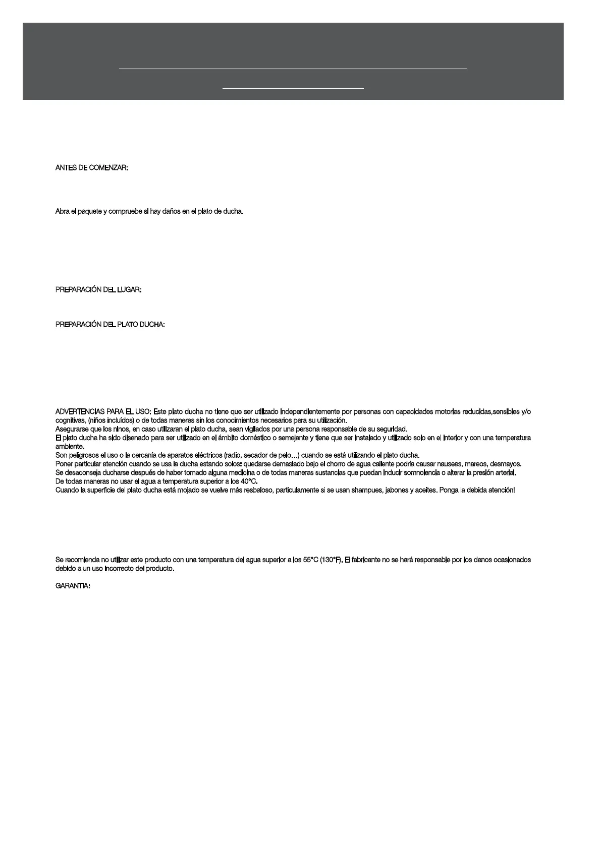 ADVERTENCIAS PARA EL USO: Este plato ducha no tiene que ser utilizado independientemente por personas con capacidades motorias reducidas,sensibles y/o