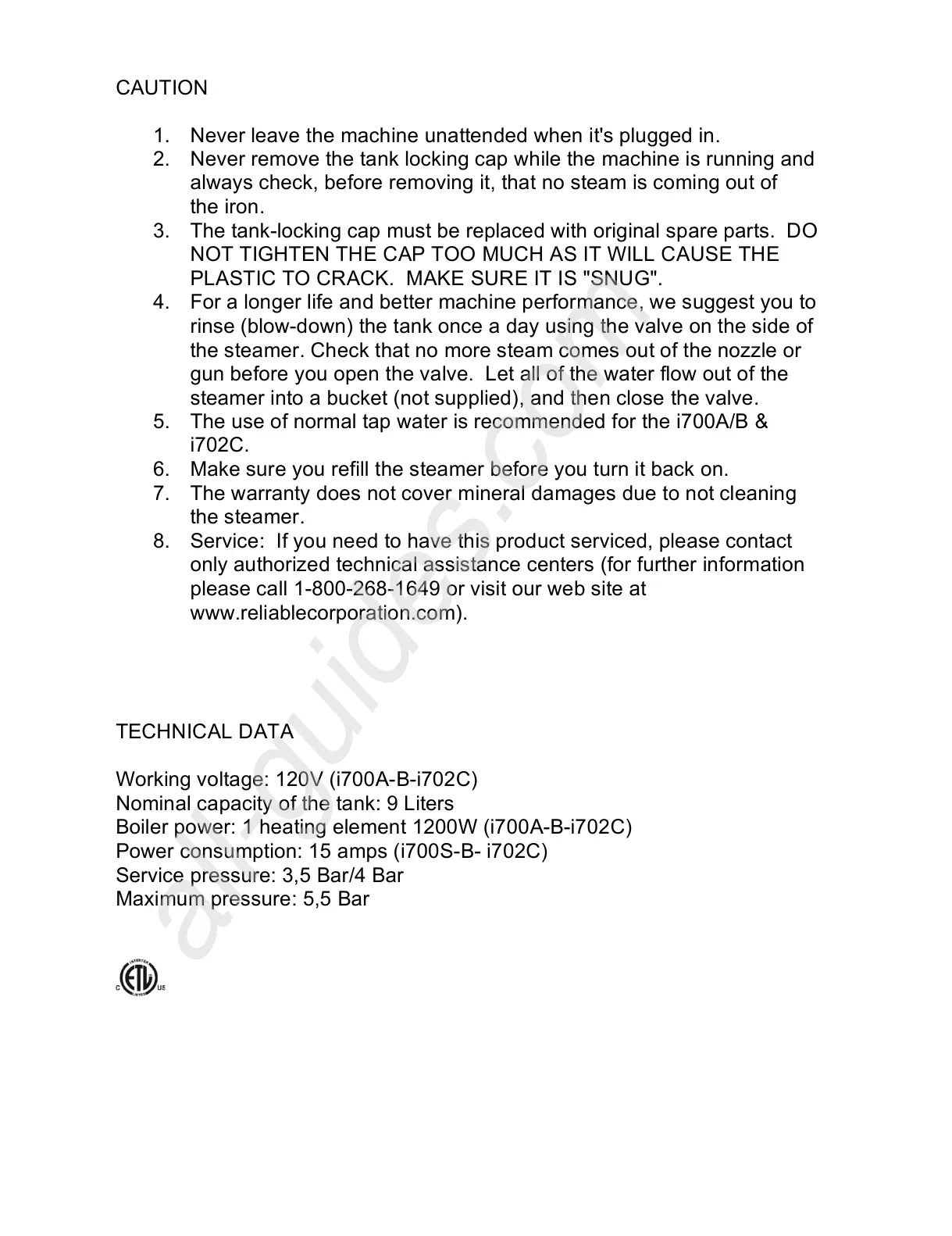 Boiler power: 1 heating element 1200W (i700A-B-i702C)