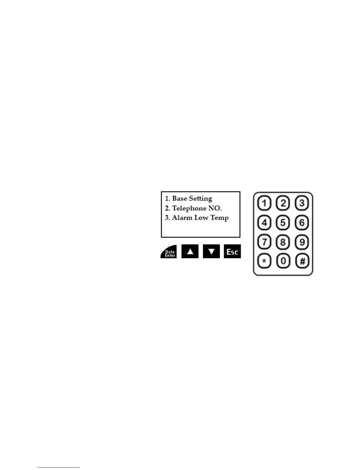 Telephone NO. menu (actual outgoing telephone numbers you are to program) along with the Alarm Low Temp. menu