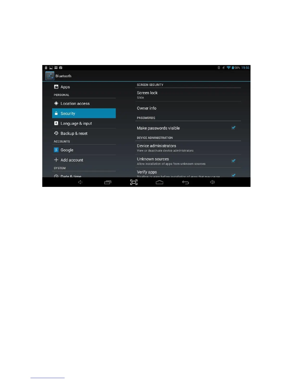 The Security option allows you to setup how secure you want your Tablet to be.