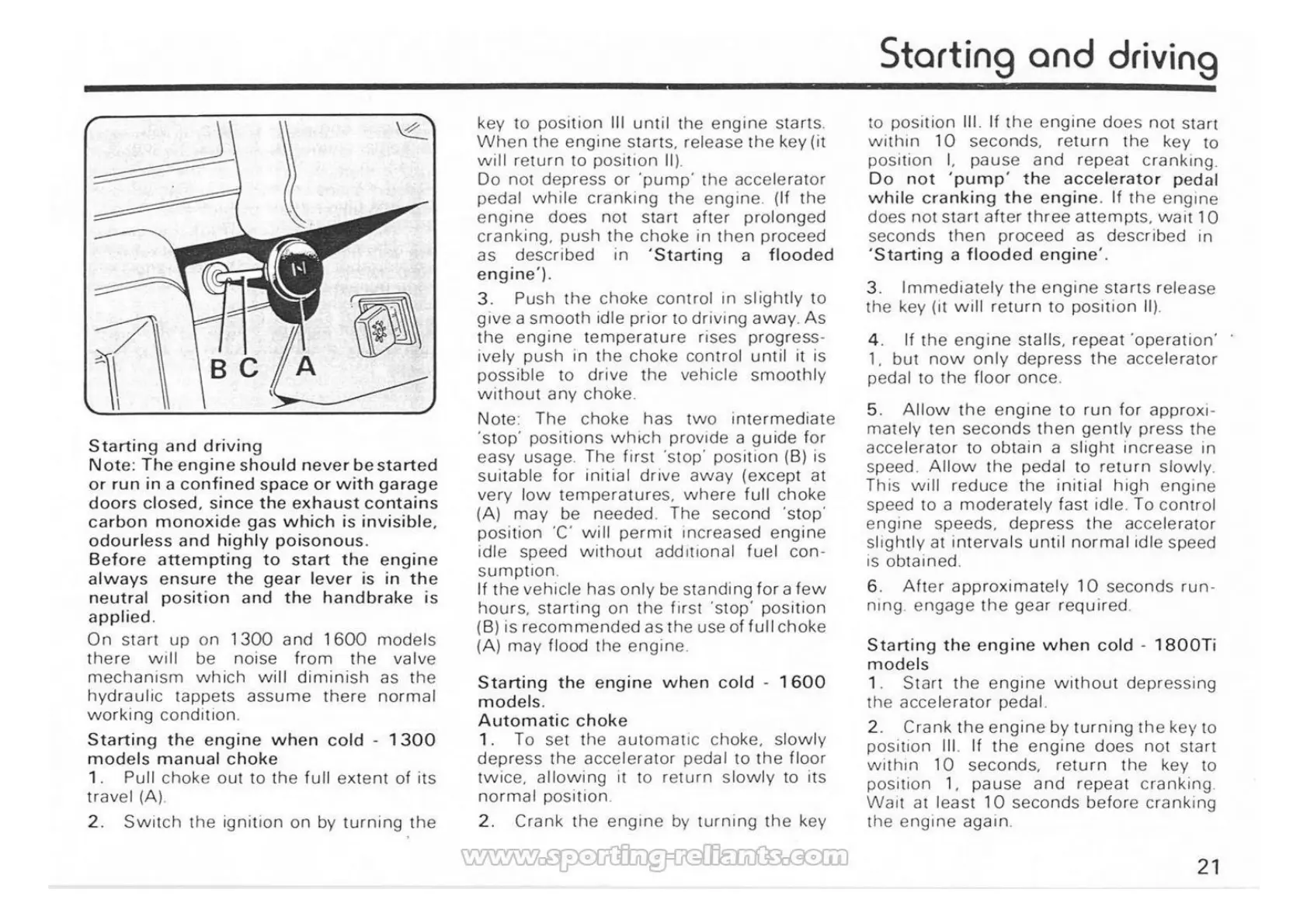 Reliant Scimitar SS1 - Starting and Driving; Cold Engine Starting Procedures