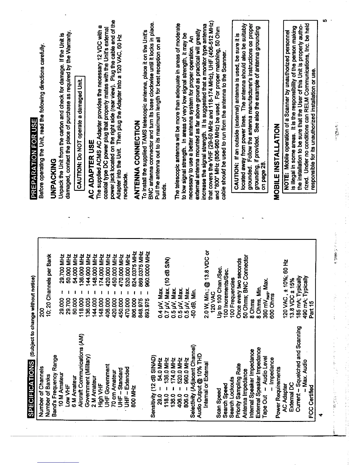 RELM MS200 - SPECIFICATIONS; PREPARATION FOR USE; UNPACKING; AC ADAPTER USE